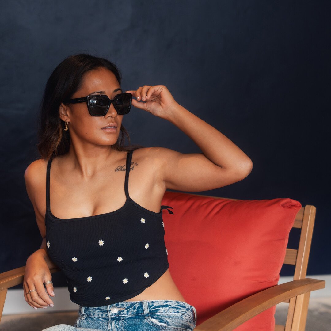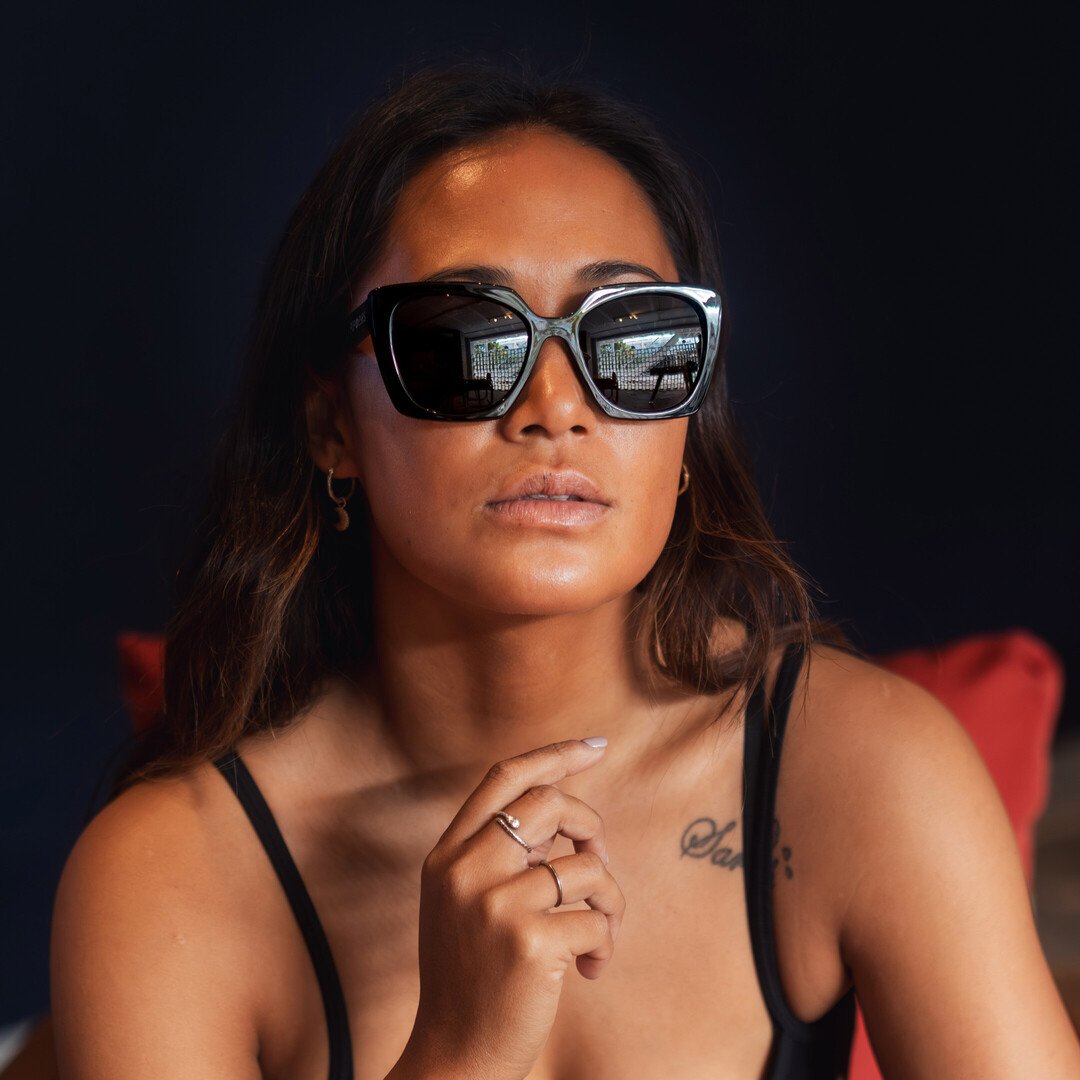 With my bold, angular design and glossy black frame, I bring strong fashion attitude to your look. My striking shape feels bold, edgy, and confident – perfect for girls who love their style and aren’t afraid to stand out. My silhouette is intentionally expressive and makes a clear fashion statement. Whether it’s a festival, beach day, or summer party – with me, every outfit instantly becomes an eye-catcher.